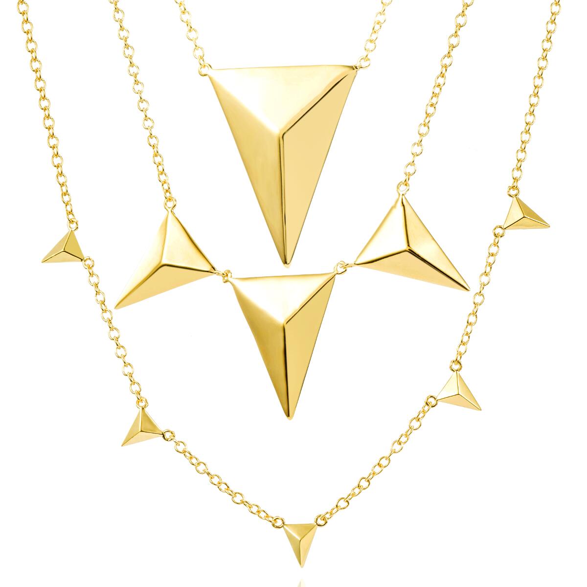 Diese 3 Ketten mit pyramidenförmigen Anhängern begeistern durch die moderne Optik. Die Ketten sind perfekt dazu geeignet jedem Outfit einen coolen und lässigen Look zu verleihen und Ihnen viele bewundernde Blicke und Komplimente einzubringen. Die individuelle Tragelänge lässt sich durch eine integrierte Verlängerungskette einstellen. Geschlossen werden die Halsketten mit einem praktischen Karabinerverschluss.Die Ketten wurden in 18 Karat (750er Gold) vergoldet und garantieren daher eine luxuriöse Ausstrahlung, dauerhafter Glanz, kein Abfärben durch die Vergoldung, rostfrei, nickelfrei, hochwertig verarbeitet, Farbe und Glanz wie echtes Gold.