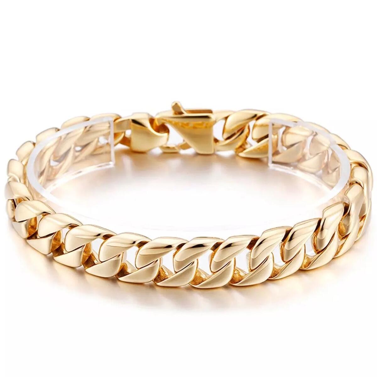 Verleihe Deinem schlichten Look etwas extra Flair mit diesem Panzerarmband. Gefertigt aus langlebigem 10mm breitem Edelstahl in atemberaubendem Goldton und mit 18 Karat Gold vergoldet. Die hochglanzpolierte Oberfläche besticht mit ihrem authentischen Glanz und macht das Schmuckstück zu einem echten Hingucker.