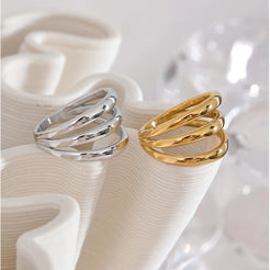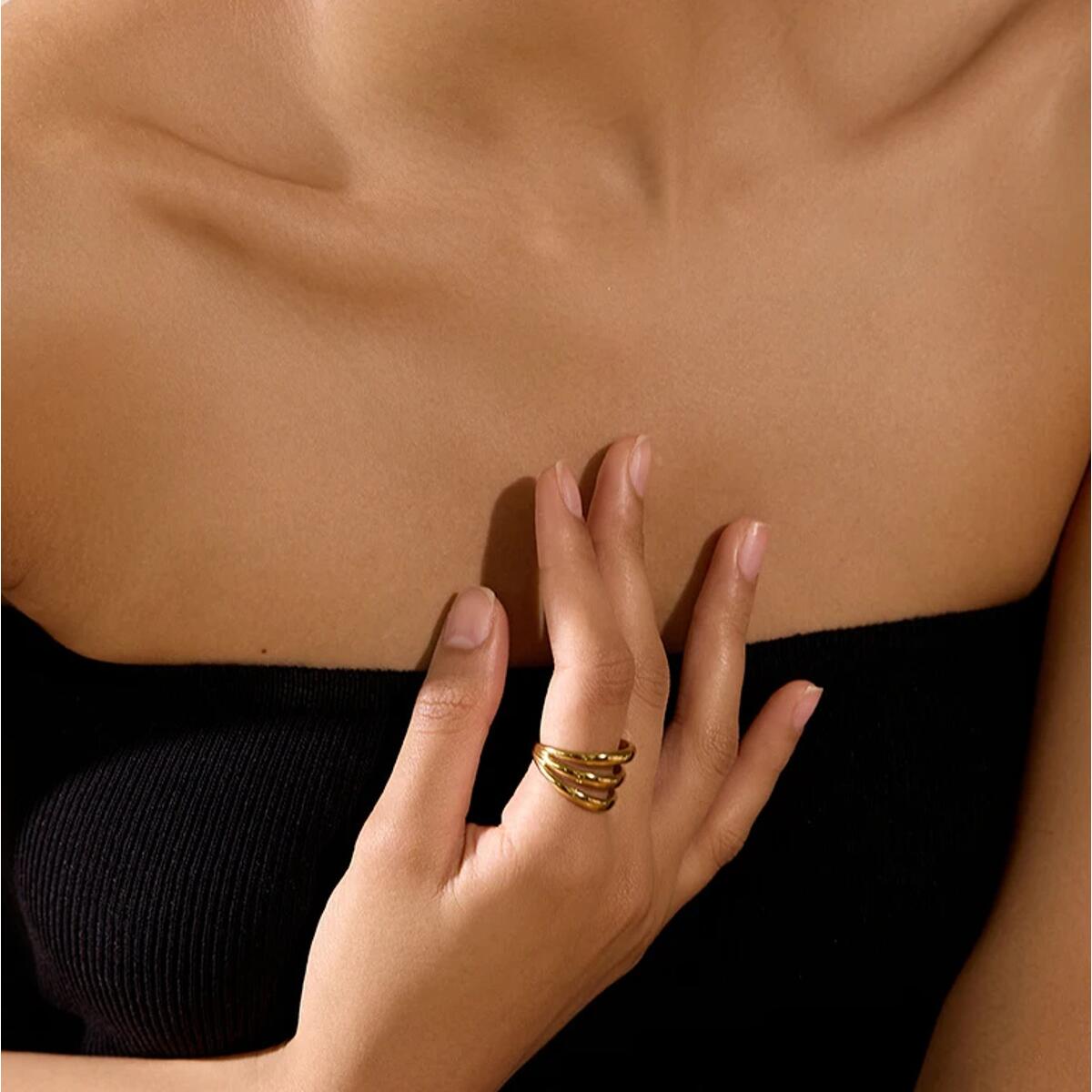 Lieferzeit: 2- 3 TageThree Waves RingDieser elegante Ring von DJADEE ist inspiriert von der Schönheit der Meereswellen. Seine wellenförmige Optik erinnert an die Kraft und Bewegung des Meeres. Zudem ist der Ring wasserfest und somit für Aktivitäten am Strand oder Schwimmen geeignet. Der DJADEE Damen Three Waves Ring aus 18 Karat vergoldetem Edelstahl ist ein elegantes und zeitloses Schmuckstück. Dieser Ring ist wasserfest, nickelfrei und hypoallergen, was ihn zu einer perfekten Wahl für alle macht, die unter Metallallergien leiden. Mit seinem boho-inspirierten Design und den sanften Wellenlinien verleiht er jedem Outfit einen stilvollen Touch. Ob am Strand, auf einer Reise oder für besondere Anlässe, dieser Ring ist ein Muss für jede moderne Frau. Verschenken Sie dieses einzigartige Accessoire an eine geliebte Person oder gönnen Sie sich selbst ein Stück Luxus. Der DJADEE Three Waves Ring ist ein Geschenk, das garantiert Freude bereitet.AUSGEZEICHNETE QUALITÄT: Keine Verfärbung, keine Hautreizung! Der Ring ist aus hochwertigem Edelstahl316L, 18 Karat Gold vergoldet, mit einem edel-glänzenden Finish, sodass Du garantiert lange Zeit große Freude an diesem Schmuckstück hast. Qualität, die jeder an deiner Hand sofort erkennen wird. Der Ring wurde aufwendig mit 3 Goldschichten 18 Karat (750er) Gold vergoldet und garantiert daher eine luxuriöse Ausstrahlung. Dauerhafter Glanz, kein Abfärben durch die Vergoldung, rostfrei, nickelfrei, hochwertig verarbeitet, Farbe und Glanz wie echtes Gold.WIDERSTANDSFÄHIG – Durch die hochwertige Vergoldung, erhält unser Schmuck einen extra starken Schutz und behält seine Farbe selbst im Salzwasser oder unter der Dusche. Die Beschichtung ist besonders haltbar und kann langlebig halten. Zusätzlich werden alle Schmuckstücke mit einer Anlaufschutzschicht für langanhaltenden Glanz veredelt.
