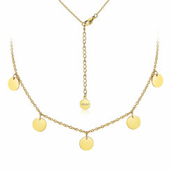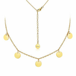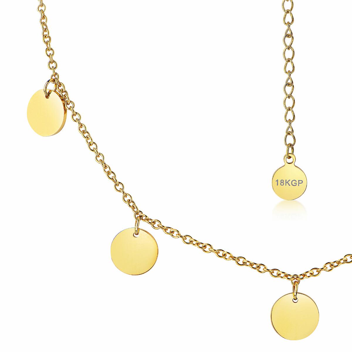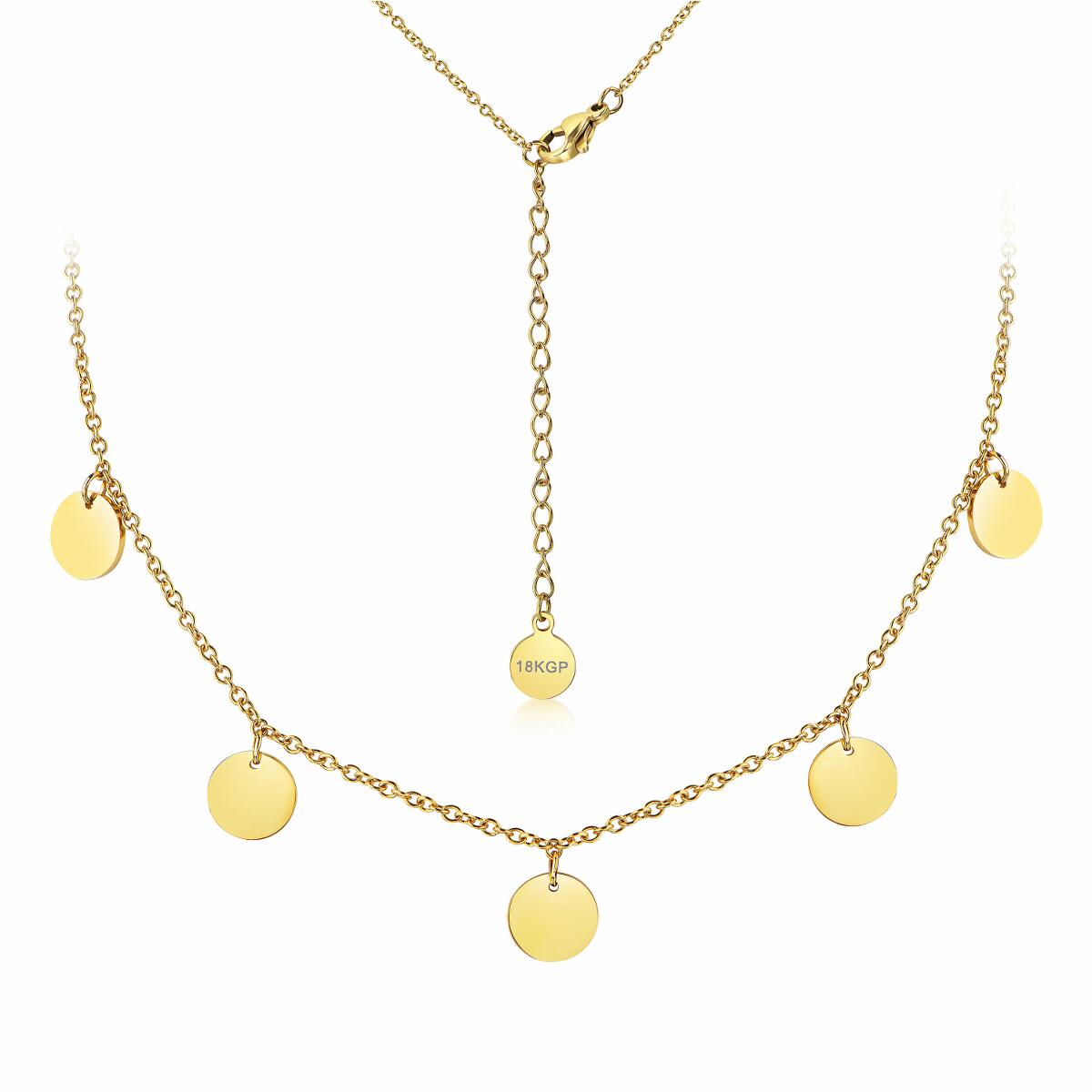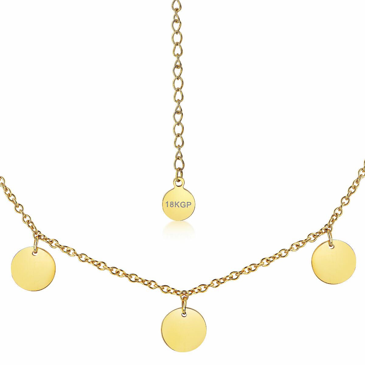 Diese Kette begeistert mit ihrem edlen Goldglanz. Zarte Halskette aus Edelstahl ist mit 7 runden Plättchen versehen, welche das Licht schön reflektieren. Sie schmiegt sich schön an den Hals und kann Tag und Nacht getragen werden. Das Design hat einen eleganten, femininen Look und wird die Aufmerksamkeit aller auf sich ziehen. Diese schicke Halskette sieht umwerfend aus in Kombination mit weiteren Anhängern oder -ketten.Schmuck aus Edelstahl: Edelstahlschmuck ist bei vielen modebewussten Leuten sehr beliebt, da Schmuck aus 316L-Edelstahl nicht nur eine gute Farbe aufweist, sondern auch viele Vorteile bietet.