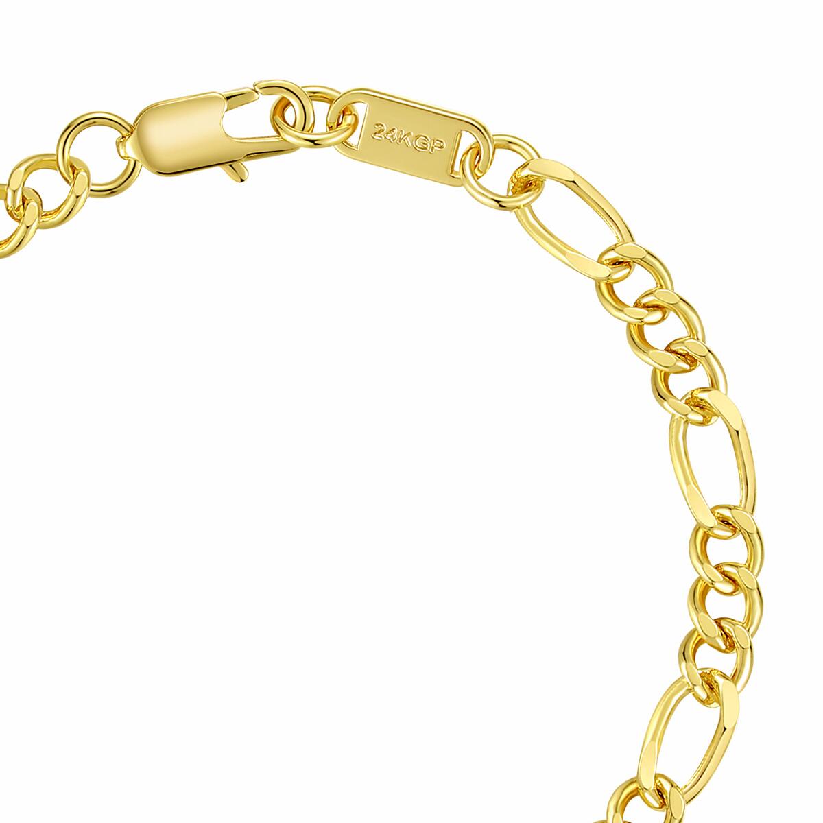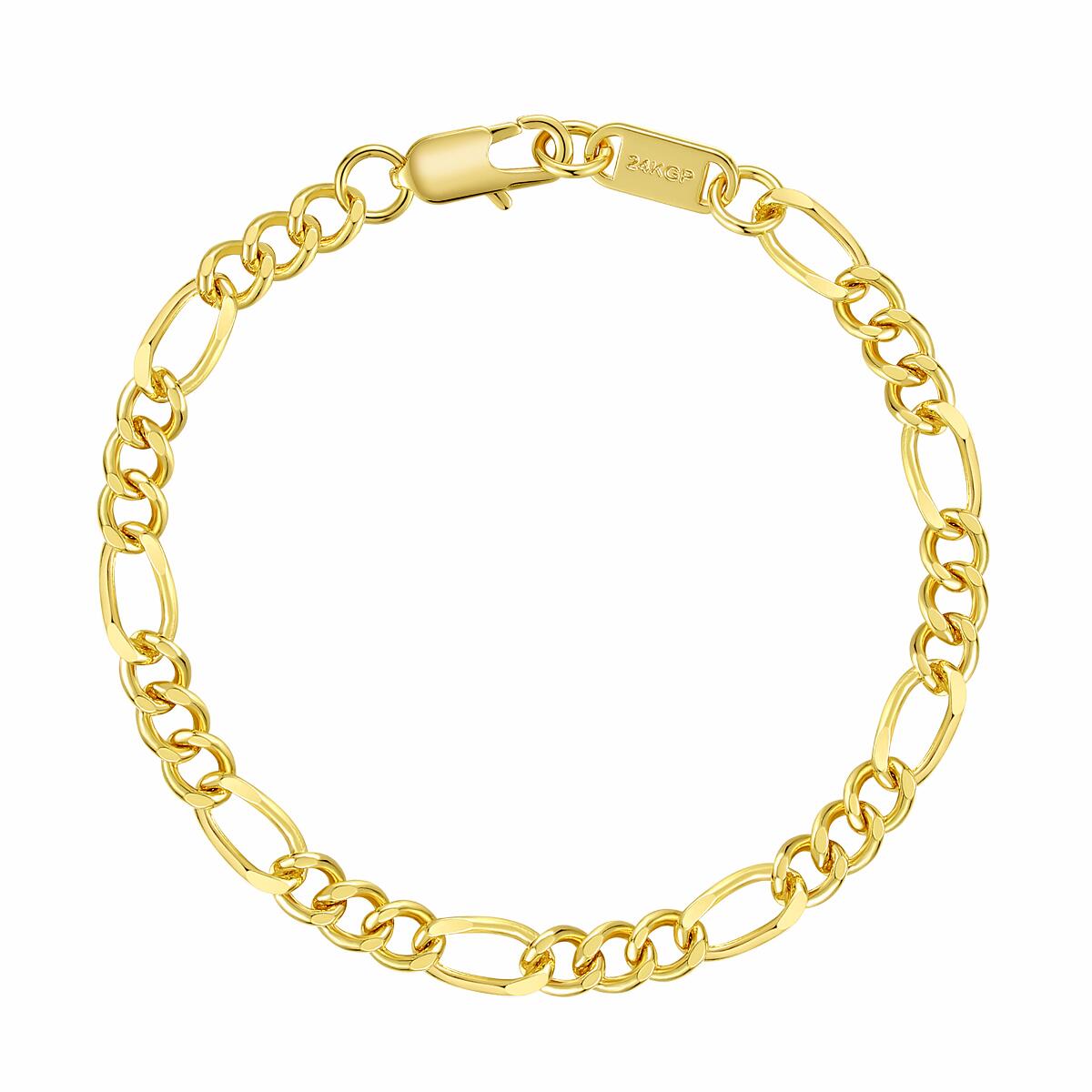 Figaro ArmbandKlassisch und vielseitig kombinierbar. Einzeln schlicht und feminin, aber auch perfekt in Kombination mit anderen Armbänder - so präsentiert sich dieses glänzende Figaro Armband. Die Breite beträgt 5 mm, als Verschluss dient ein Karabiner. Passend zu diesem Armband gibt es eine Kette als perfekte Ergänzung.QUALITÄT - Das Armband ist 24 Karat (999er Gold) vergoldet und garantiert daher eine luxuriöse Ausstrahlung, dauerhaften Glanz, kein Abfärben, rostfrei, nickelfrei, hochwertig verarbeitet, Farbe und Glanz wie echtes Gold. Durch die hochwertige Vergoldung, erhält unser Schmuck einen extra starken Schutz und behält seine Farbe selbst im Salzwasser oder unter der Dusche.
