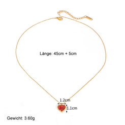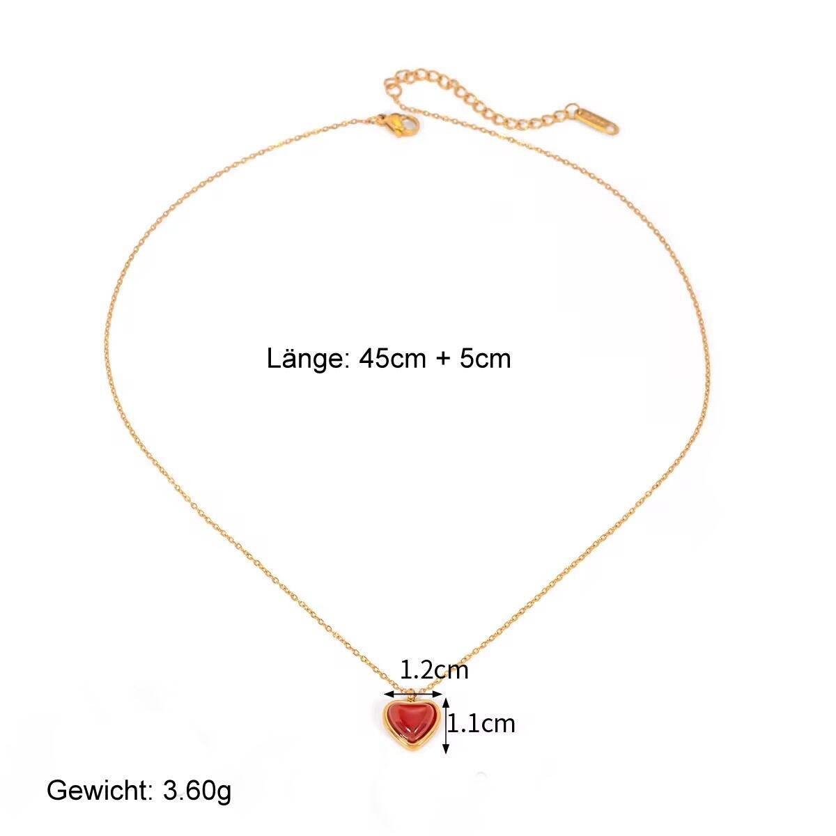 Lovely Heart KetteWerte deine Schmucksammlung mit dieser exquisiten Halskette mit Herzanhänger auf. Diese Halskette aus hochwertigem, 18 Karat vergoldetem Edelstahl verfügt über ein atemberaubendes Mittelstück aus rotem Achatstein, das einen Hauch natürlicher Eleganz verleiht. Das wasserfeste Design sorgt für anhaltende Schönheit beim täglichen Tragen, während die hypoallergenen Materialien es für empfindliche Haut geeignet machen. Das zeitlose Herzdesign des Anhängers symbolisiert Liebe und Zuneigung und macht ihn zu einem perfekten Geschenk zum Valentinstag oder einem aufmerksamen Geschenk für eine besondere Person. Dieses vielseitige Stück passt sowohl zu legerer als auch zu formeller Kleidung und verleiht jedem Outfit eine anspruchsvolle Note. Die Halskette kombiniert Haltbarkeit mit Eleganz und ist somit ein ideales Accessoire für den Alltag oder besondere Anlässe. Ob für dich selbst oder als Geschenk für einen geliebten Menschen, diese Halskette bietet sowohl Stil als auch Qualität.AUSGEZEICHNETE QUALITÄT: Keine Verfärbung, keine Hautreizung! Die Kette besteht aus hochwertigem Edelstahl 316L, 18 Karat Gold vergoldet, mit einem edel-glänzenden Finish, sodass Du garantiert lange Zeit große Freude an diesem Schmuckstück hast. Qualität, die jeder sofort erkennen wird. Die Kette wurde aufwendig mit 3 Goldschichten vergoldet und garantiert daher eine luxuriöse Ausstrahlung, dauerhaften Glanz, kein Abfärben, rostfrei, nickelfrei, hochwertig verarbeitet, Farbe und Glanz wie echtes Gold.WIDERSTANDSFÄHIG: Durch die hochwertige Vergoldung, erhält unser Schmuck einen extra starken Schutz und behält seine Farbe selbst im Salzwasser oder unter der Dusche. Die Beschichtung ist besonders haltbar und kann lange Zeit halten. Zusätzlich werden alle Schmuckstücke mit einer Anlaufschutzschicht für langanhaltenden Glanz veredelt.