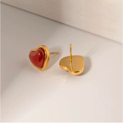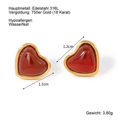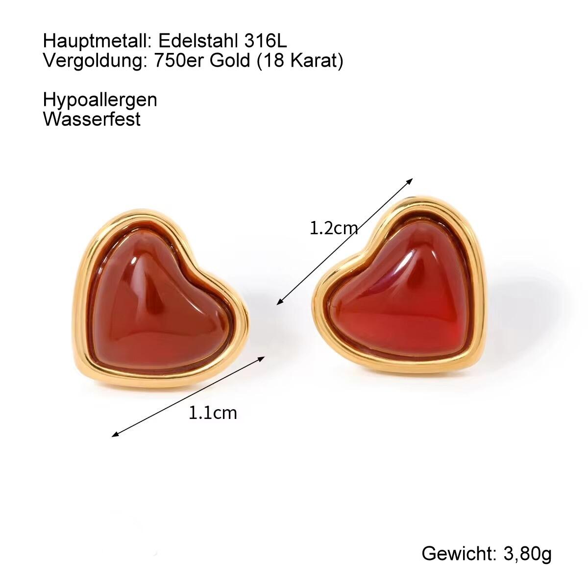 Erweitern Sie Ihre Schmuckkollektion mit diesen exquisiten herzförmigen Ohrringen. Diese Ohrstecker aus 18 Karat vergoldetem Edelstahl sind mit atemberaubenden roten Achatsteinen verziert, die einen Hauch natürlicher Schönheit und Eleganz verleihen. Das klassische Herzdesign macht diese Ohrringe zur perfekten Wahl, um Liebe und Zuneigung auszudrücken. Ihre wasserfesten und hypoallergenen Eigenschaften sorgen für bequemes, sorgenfreies Tragen für empfindliche Ohren. Das vielseitige Design passt wunderbar zu legerer und formeller Kleidung und macht diese Ohrringe für den Alltag oder besondere Anlässe geeignet. Egal, ob Sie nach einem bedeutungsvollen Geschenk zum Valentinstag oder einem besonderen Geschenk für einen lieben Menschen suchen, diese eleganten Ohrringe werden wunderschön verpackt geliefert und bereiten Freude. Die zeitlose Anziehungskraft dieser Herzohrstecker macht sie zu einer geschätzten Ergänzung für jede Schmuckschatulle.AUSGEZEICHNETE QUALITÄT: Keine Verfärbung, keine Hautreizung! Die Ohrringe sind aus hochwertigem Edelstahl, 18 Karat Gold vergoldet, mit einem edel-glänzenden Finish, sodass Du garantiert lange Zeit große Freude an diesem Schmuckstück hast. Qualität, die jeder an deinem Ohr sofort erkennen wird. Die Ohrringe wurden aufwendig mit 3 Goldschichten vergoldet und garantieren daher eine luxuriöse Ausstrahlung. Dauerhafter Glanz, kein Abfärben durch die Vergoldung, rostfrei, nickelfrei, hochwertig verarbeitet, Farbe und Glanz wie echtes Gold.WIDERSTANDSFÄHIG – Durch die hochwertige Vergoldung, erhält unser Schmuck einen extra starken Schutz und behält seine Farbe selbst im Salzwasser oder unter der Dusche. Die Beschichtung ist besonders haltbar und kann langlebig halten. Zusätzlich werden alle Schmuckstücke mit einer Anlaufschutzschicht für langanhaltenden Glanz veredelt.