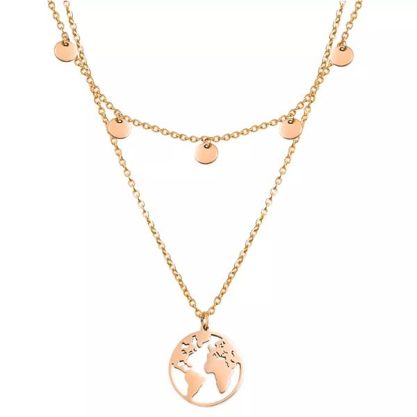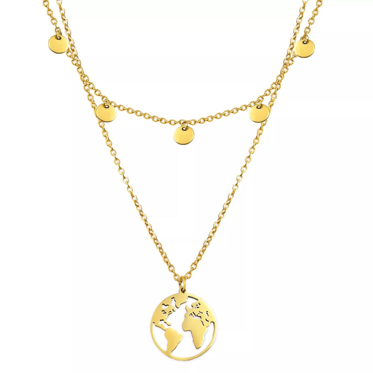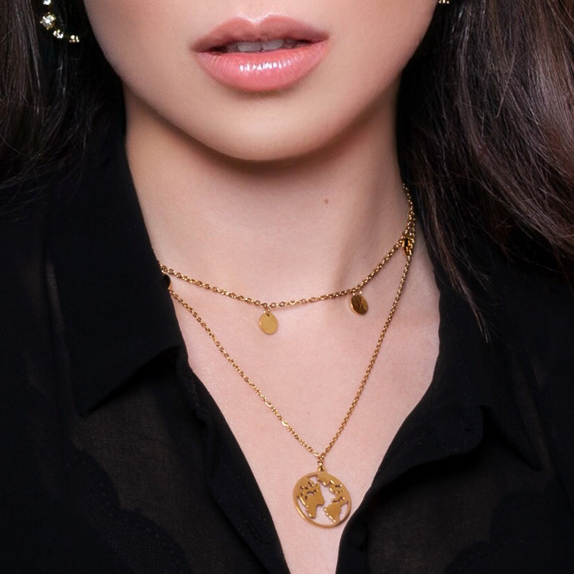 Stilvolle Doppelkette mit trendigem Weltkarten-Design und Plättchen. Diese filigrane Weltkarte hängt an einer feinen Kette und ist ein echtes"Must-Have" Accessoire für jede Weltentdeckerin. Ein besonderes Stück, das dich an tolle Abenteuer, schöne Erlebnisse und einzigartige Momente auf deinen Reisen erinnern soll.Die Kette wurde in 18 Karat (750er Gold) vergoldet und garantiert daher eine luxuriöse Ausstrahlung, dauerhafter Glanz, kein Abfärben durch die Vergoldung, rostfrei, nickelfrei, hochwertig verarbeitet, Farbe und Glanz wie echtes Gold. Durch die hochwertige Vergoldung, erhält unsere "My World" - Kette einen extra starken Schutz und behält ihre Farbe selbst im Salzwasser oder unter der Dusche.