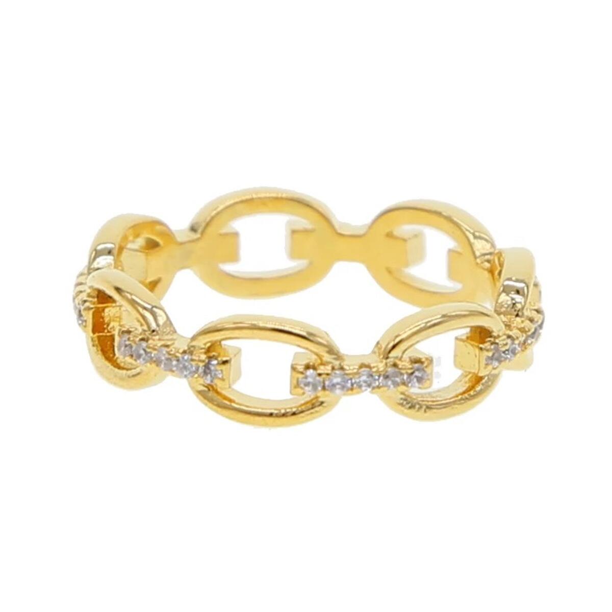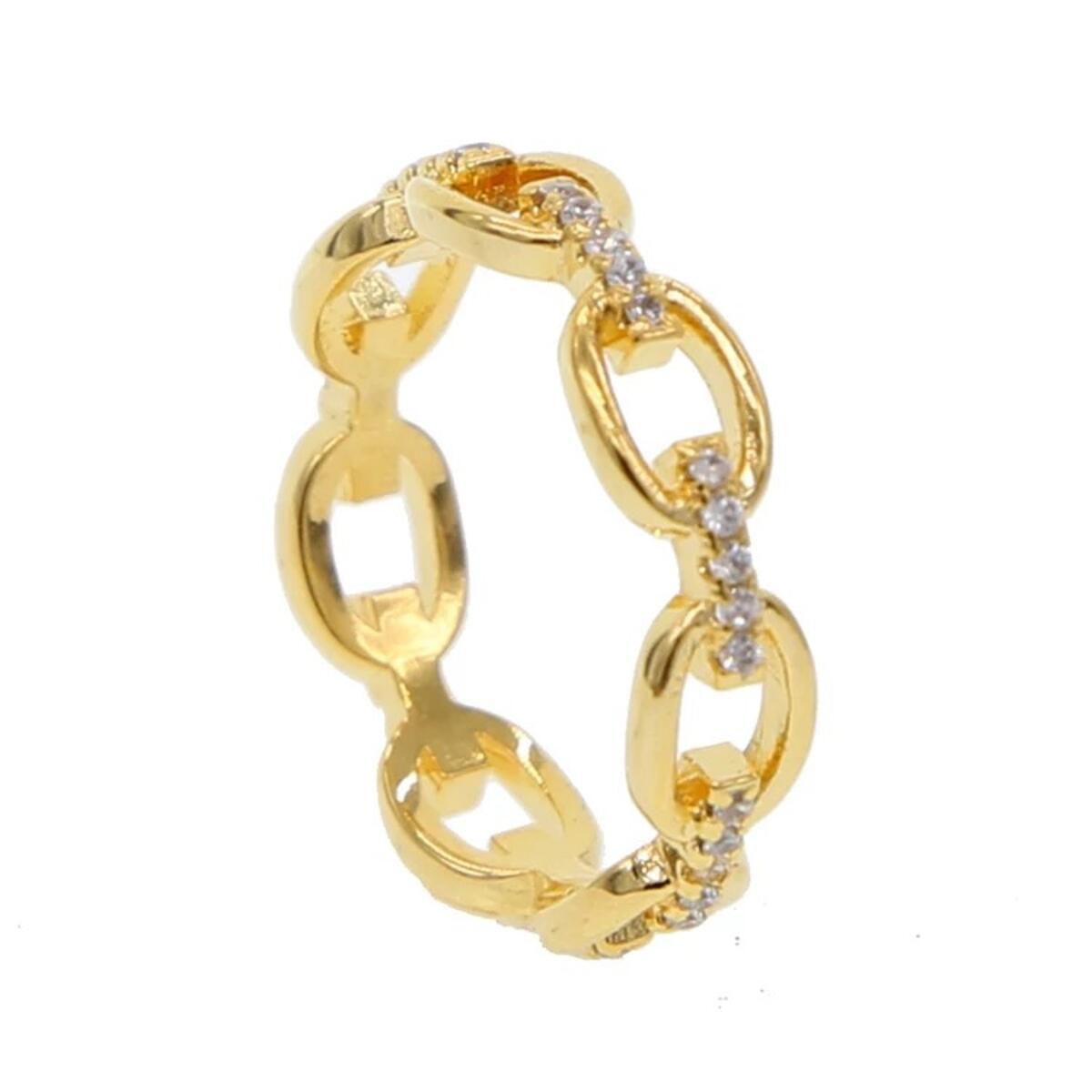 Der 18-karätig vergoldeter, kettenförmiger Ring "Shiny" mit funkelnden Zirkoniasteinen im Brillantschliff.
