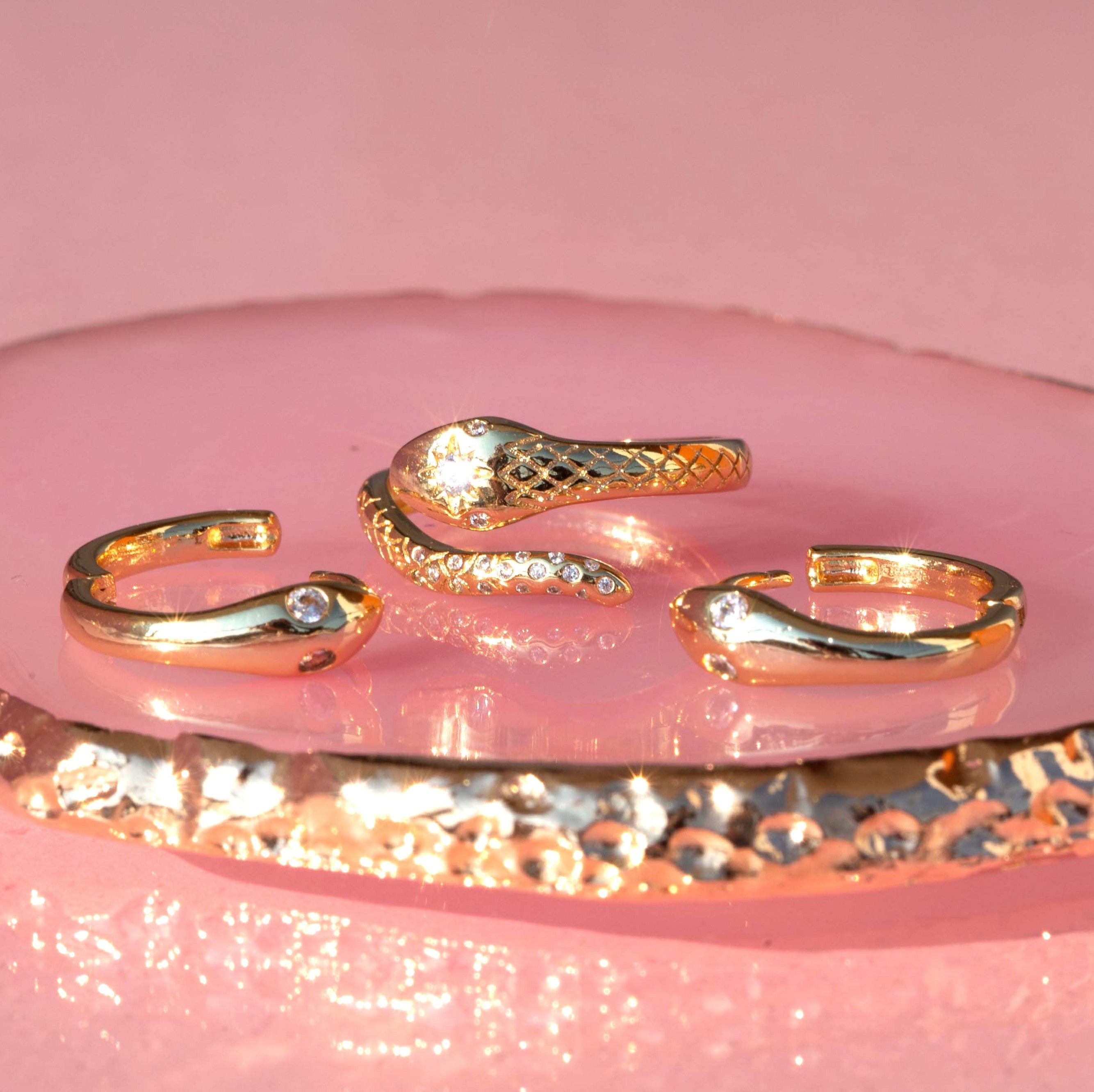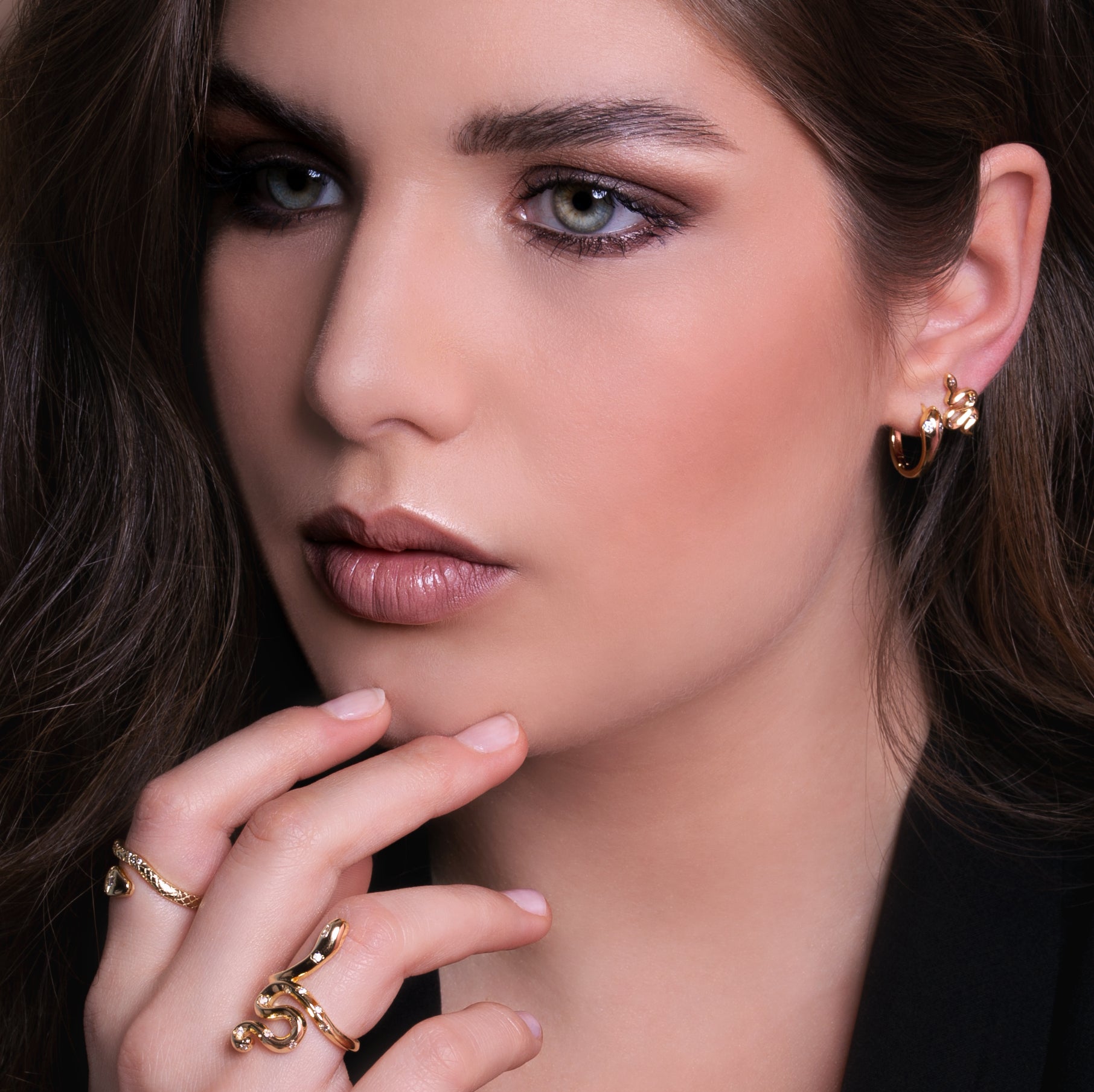 Diese eleganten "Snake" Ohrringe von DJADEE befähigen dich zur Anziehungskraft, die alle Augen fasziniert. Die Creolen können schön mit den weiteren Schmuckstücken aus unserer Trend Kollektion kombiniert werden.