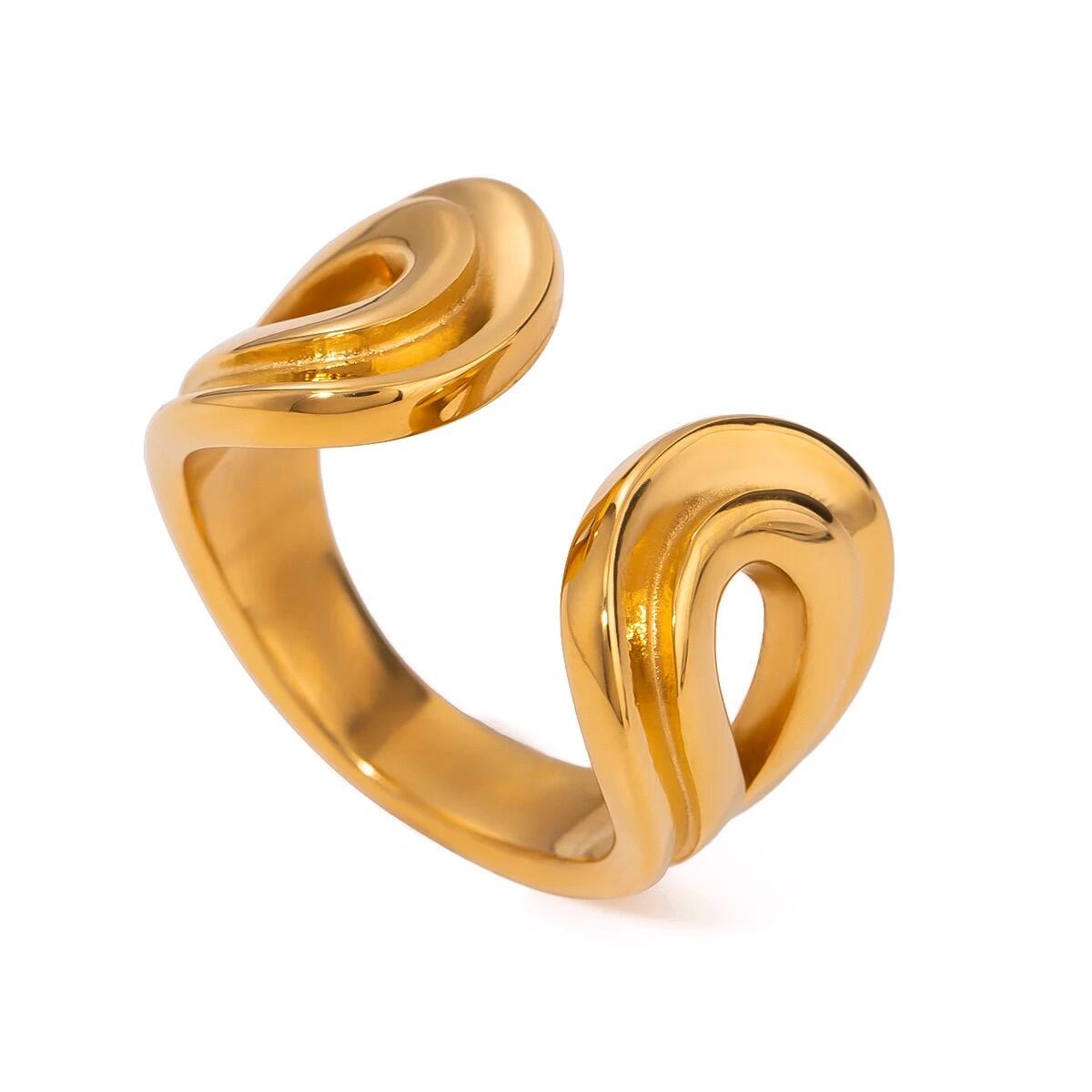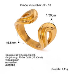 Lieferzeit: 2- 3 TageWaterfall RingDer DJADEE Damen Waterfall Ring ist ein elegantes Schmuckstück aus 750er Gold und 18 Karat Edelstahl 316L. Inspiriert von der Schönheit des Meeres und der Liebe zur Natur, besticht dieser offene, verstellbare Ring durch seine hochglanzpolierte Oberfläche. Er ist wasserfest, hypoallergen und nickelfrei, sodass er problemlos beim Sport, Duschen und Schwimmen getragen werden kann, ohne seine Farbe zu verlieren. Mit seiner Premium-Qualität und dem zeitlosen Design ist dieser Ring ein wunderbares Geschenk für die Frau oder das Mädchen in Ihrem Leben. Lassen Sie sich von seiner Schönheit verzaubern und tragen Sie ihn zu jedem Anlass.AUSGEZEICHNETE QUALITÄT: Keine Verfärbung, keine Hautreizung! Der Ring ist aus hochwertigem Edelstahl 316L, 18 Karat Gold vergoldet, mit einem edel-glänzenden Finish, sodass Du garantiert lange Zeit große Freude an diesem Schmuckstück hast. Qualität, die jeder an deiner Hand sofort erkennen wird. Der Ring wurde aufwendig mit 3 Goldschichten vergoldet und garantiert daher eine luxuriöse Ausstrahlung, dauerhaften Glanz, kein Abfärben, rostfrei, nickelfrei, hochwertig verarbeitet, Farbe und Glanz wie echtes Gold.WIDERSTANDSFÄHIG – Durch die hochwertige Vergoldung, erhält unser Schmuck einen extra starken Schutz und behält seine Farbe selbst im Salzwasser oder unter der Dusche. Die Beschichtung ist besonders haltbar und kann langlebig halten. Zusätzlich werden unsere Schmuckstücke mit einer Anlaufschutzschicht für langanhaltenden Glanz veredelt.